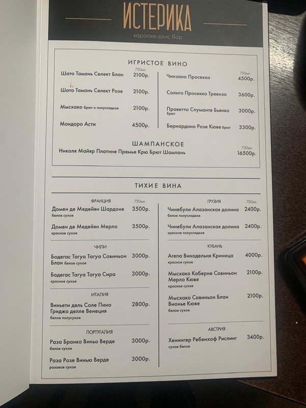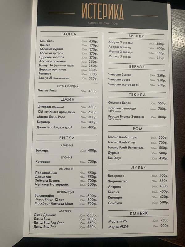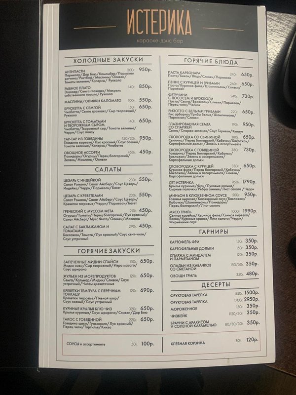 Мне нравится заведение в целом, коктейли очень классные и вкусные, офигенные: голубенькие, зелененькие, апероль. Также неплохая атмосфера, музыка и диджей, который слушает пожелания: громче или тише микрофон, музыку. Мы всегда ходим только в Караоке клуб ИСТЕРИКА, нас с мужем уже знают бармен и диджей. Из меню я чаще всего беру салат цезарь с креветкой, брали мясную нарезку под пиву, вкусная карбонара.